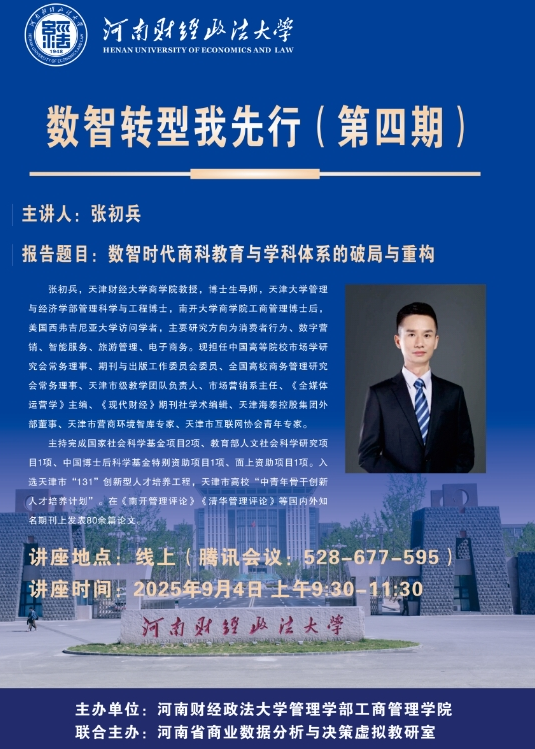 2025年9月4日上午,由365(VIP)英国上市管理学部英国上市公司365、河南省商业数据分析与决策虚拟教研室联合主办的“数智转型我先行(第四期)”线上讲座如期举行。本次讲座特邀天津财经大学商学院教授、博士生导师张初兵主讲,副院长李志兰主持,学院教师到会聆听。